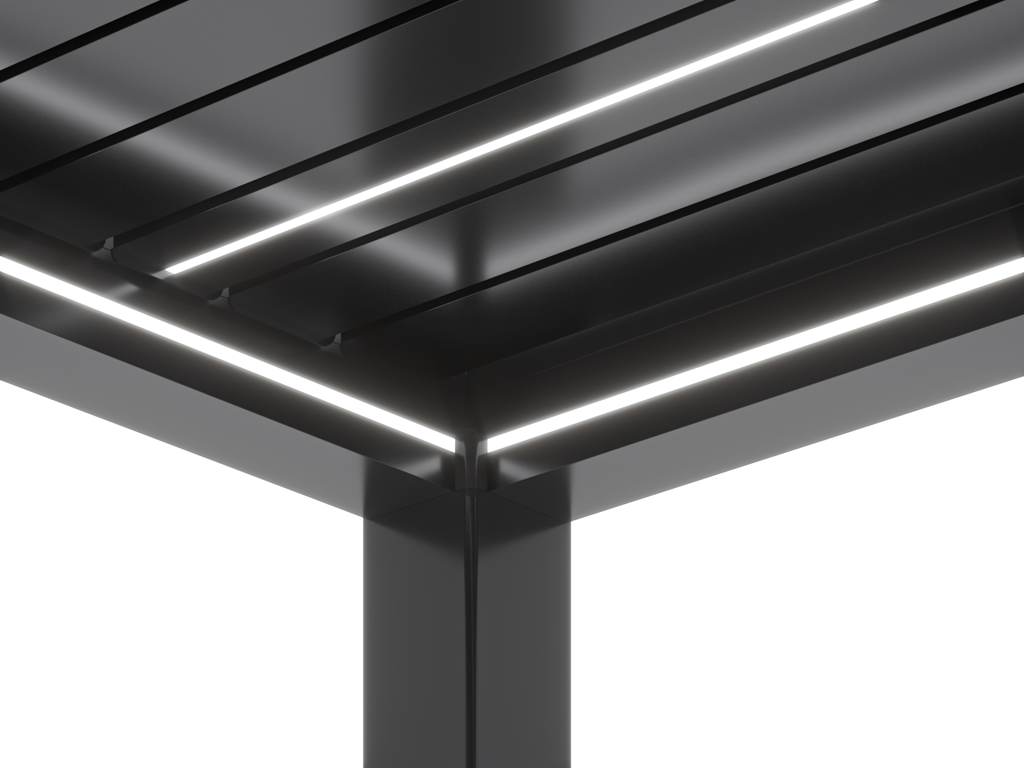 Discreet LED lighting, elegantly integrated into the louvres, casts a soft, adjustable glow—ideal for evening dips and creating a serene, resort-style ambiance.